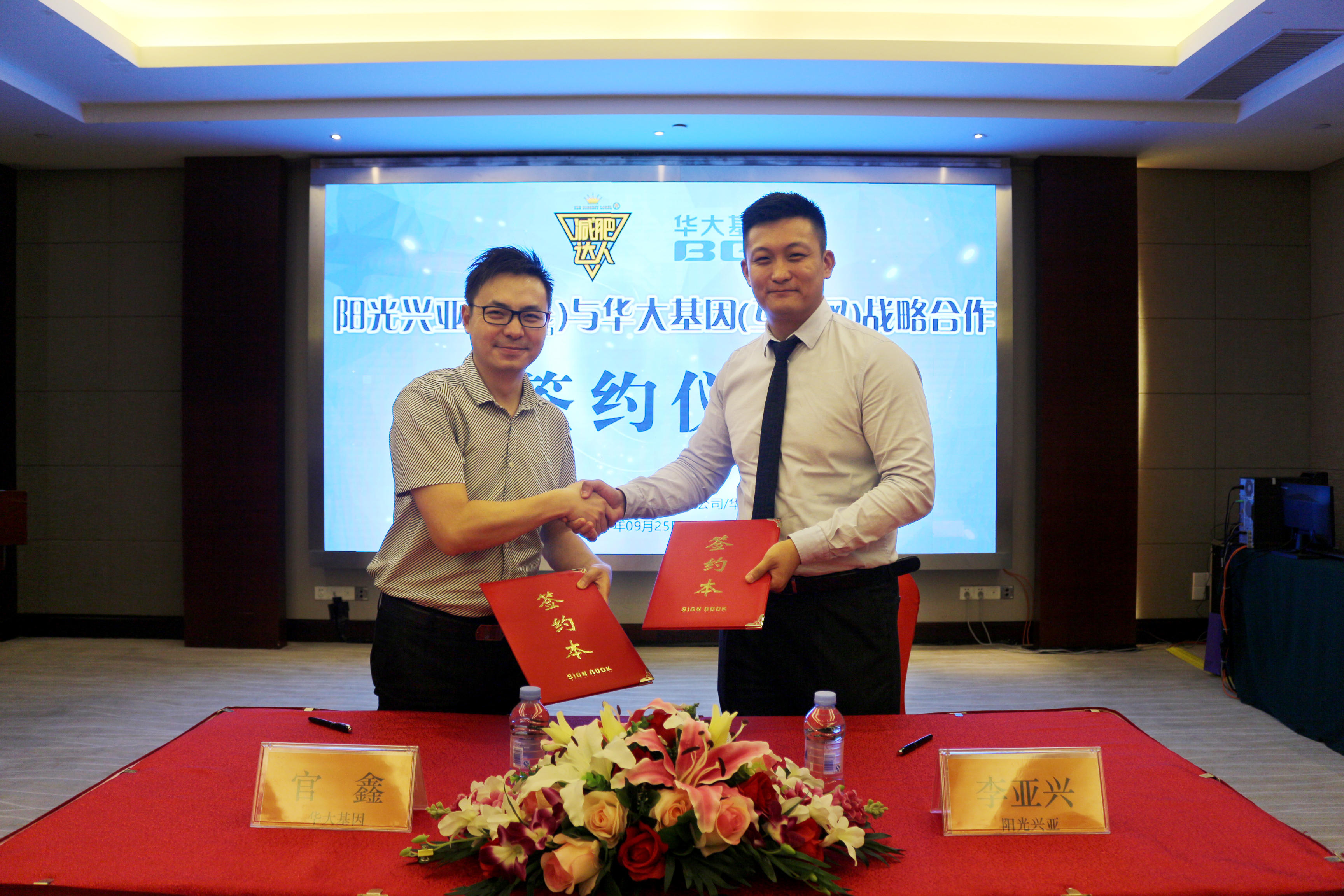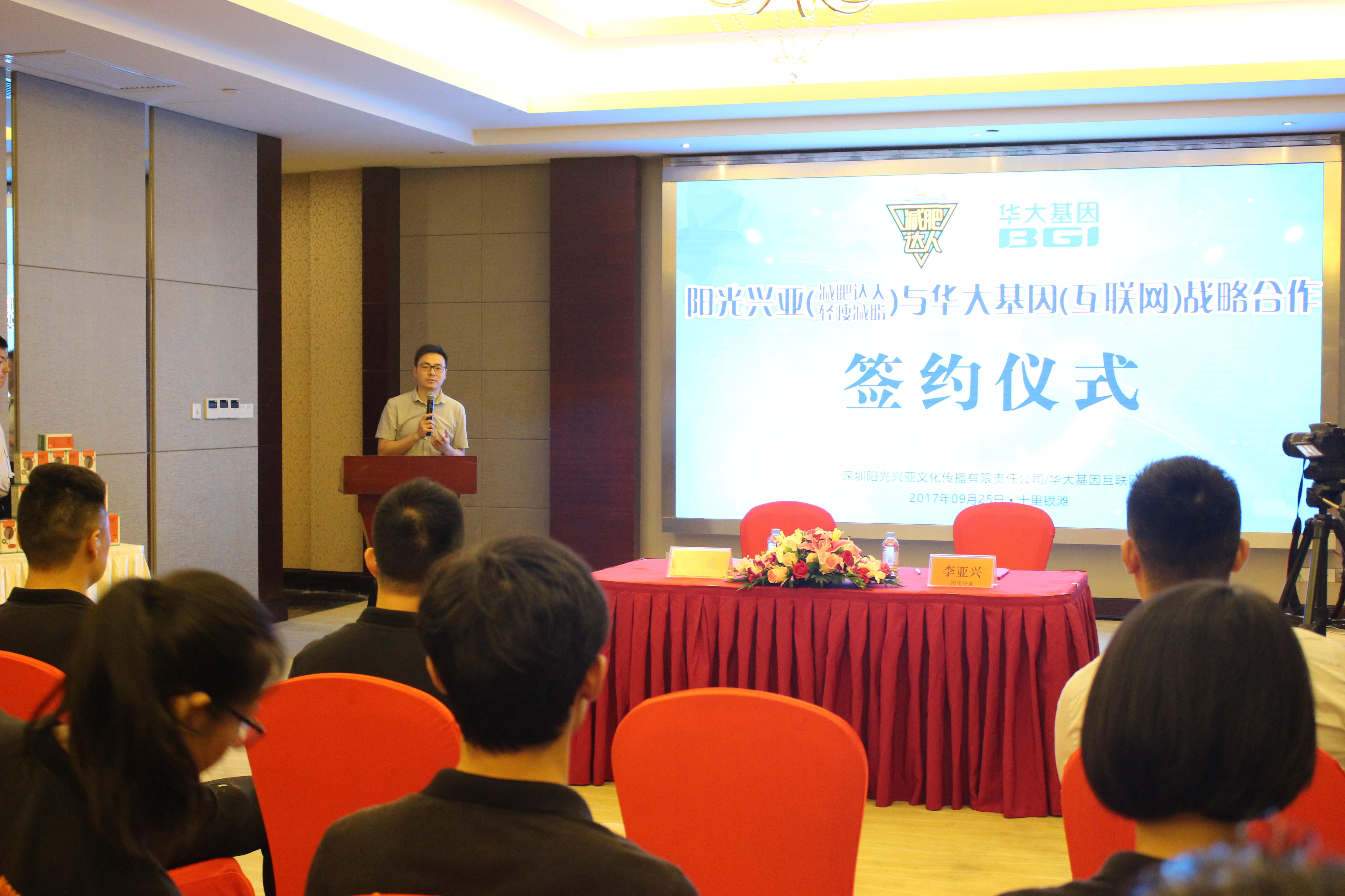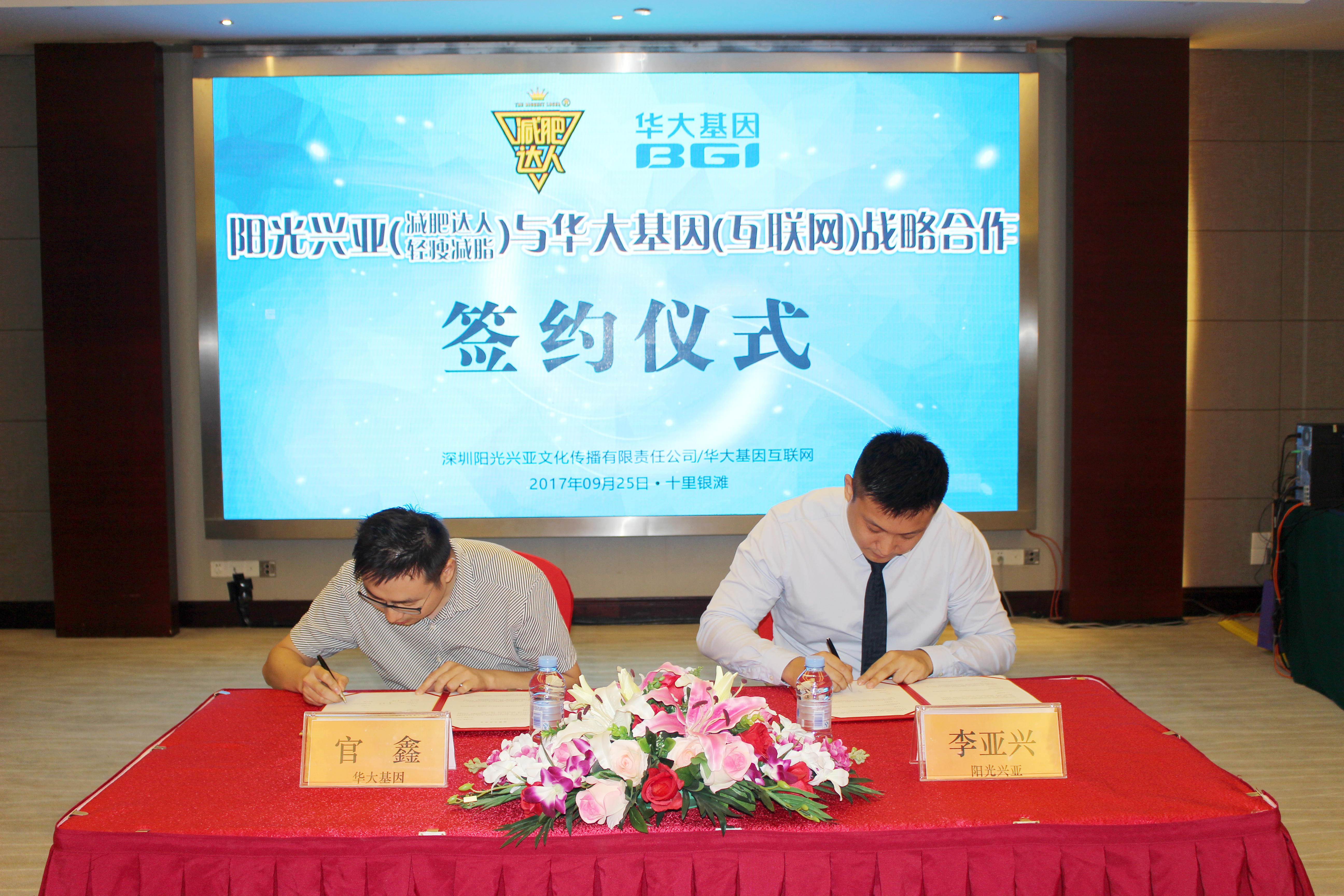 9月25日,深圳阳光兴亚文化传播有限责任公司(以下简称阳光兴亚)与华大基因互联网(以下简称华大互联网)战略合作签约仪式在减肥达人十里银滩营地举行,阳光兴亚与华大互联网达成建立长期战略合作伙伴关系的共识。阳光兴亚总经理李亚兴先生,副总经理陈华毅先生,轻瘦项目经理朱程秀女士,华大互联网副总经理官鑫先生、电商运营经理黄玲女士等双方领导出席了签约仪式。