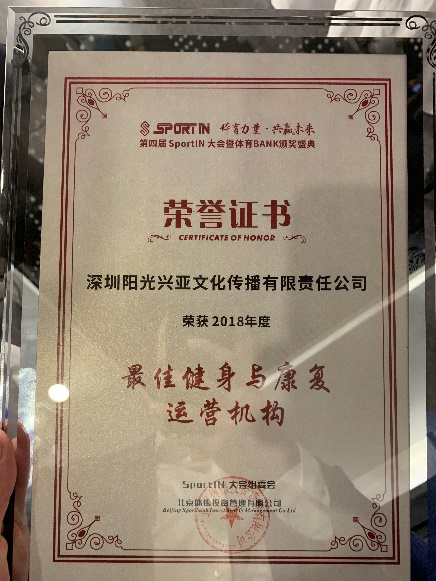 12月9日-10日,2018年第四届SPORTSIN大会暨体育BANK颁奖盛典在北京举行。深圳阳光兴亚文化传播有限责任公司荣获2018年度“最佳健身与康复运营机构”大奖。阳光兴亚副总经理马治国先生代表公司出席盛典并接受授奖。